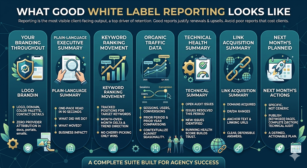 Branded monthly performance decks, real-time ranking dashboards, and client-accessible reporting portals — all stripped of the provider’s branding and delivered under your agency identity. Reporting quality is the #1 client retention lever. See the reporting section below for what good looks like.