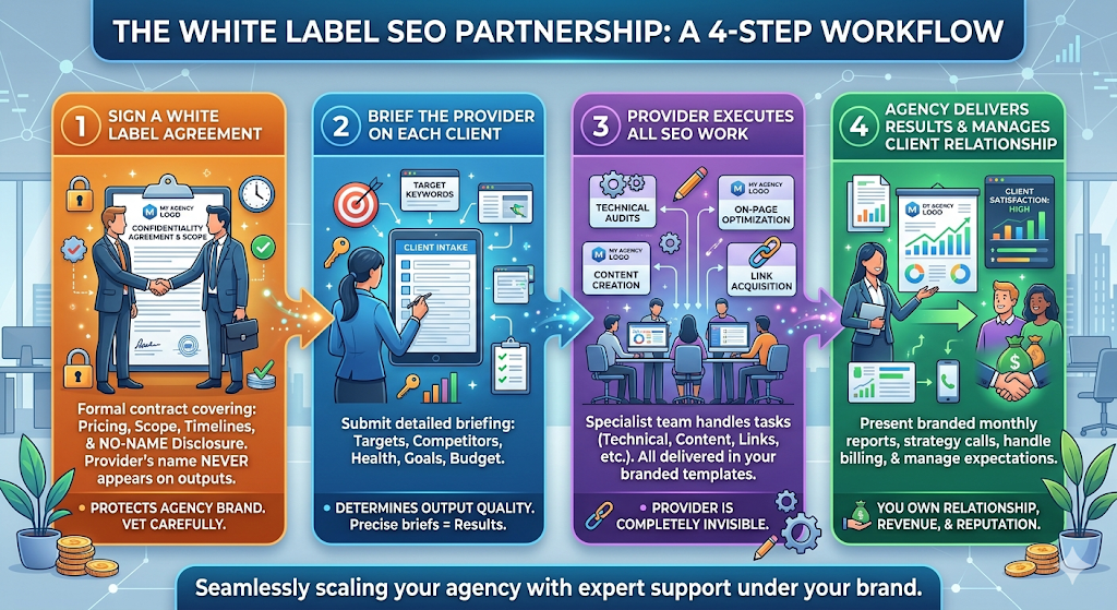 This is the most searched sub-topic for “what is white label SEO,” and the section most articles either omit or underserve. Here is the complete operational workflow, from first contact to ongoing delivery.